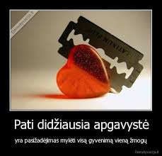 kodėl žmonės sako kad meilė atsibosta? ar taip gali būti, galbūt tiesiog jie dar nesupranta kas yra meilė? Nes meilė tas jausmas kuris žmogų gali pavesti tuo, kurio net neįsivaizduojame, tik meilė sugeba visą gyvenimą apversti 180 laipsnių kampu, ir padaryti taip kad negali gyventi be žmogaus. Bet pasirodo ir meilė dažnai apgauna.. dažnai ji būna tik vienpusiška, nors iš pradžių atrodo kad jie yra neišskiriami, mėnesis po mėnesio, ta rutina, o dar atstumas, atšaldo jausmus, bet jeigu tai meilė, nesvarbu kliūtys. Gal tai ne meilė? gal tai naivus susižavėjimas žmogumi, ir nesvarbu kad metai kartu praleisti, bet tu tiesiog nepasiruošęs tam.. O kas skaudžiausia, kad žmogus vietoj pripažinęs kad nebemyli tavęs, jis tave apgaudinėja. Tiesiog Žaidi su kelių žmonių jausmais vienu metu, bijai pripažinti kad nebemyli, nes manai kad dar kažką jauti. ar tai įmanoma?